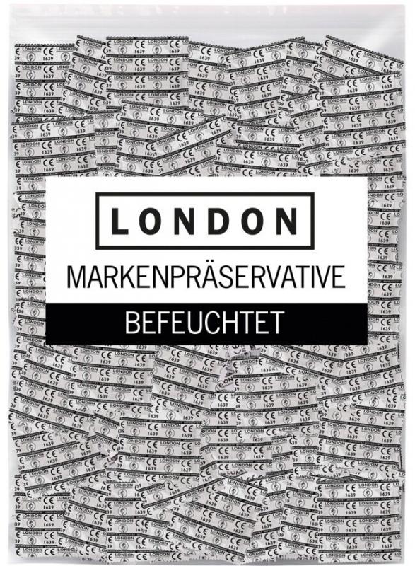 1000 průhledných kondomů LONDON je potaženo silikonovým lubrikantem a má savičky na konci. Jsou jednotlivě baleny (6 x 6 cm) a dodávají se v sáčku.